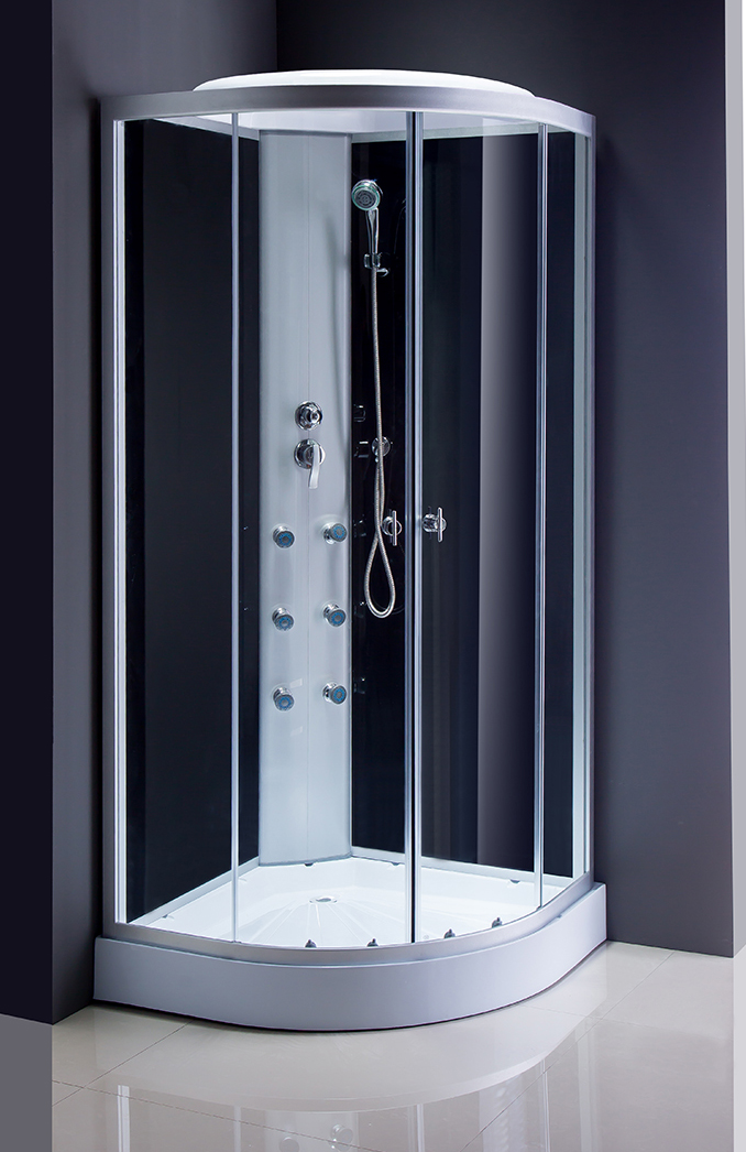 Dušo kabinos priekiniai stiklai pilkai tonuoti (grey), galiniai juodi.
