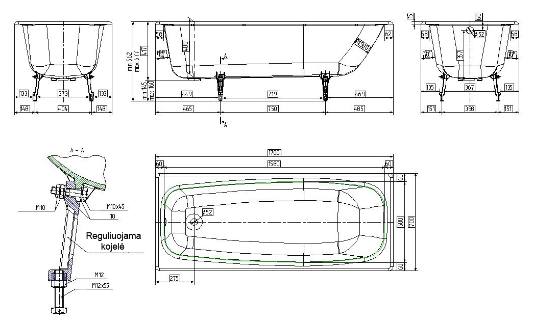 Vonios aukštis su reguliuojamomis kojelėmis: min 562 mm, max. 577 mm.