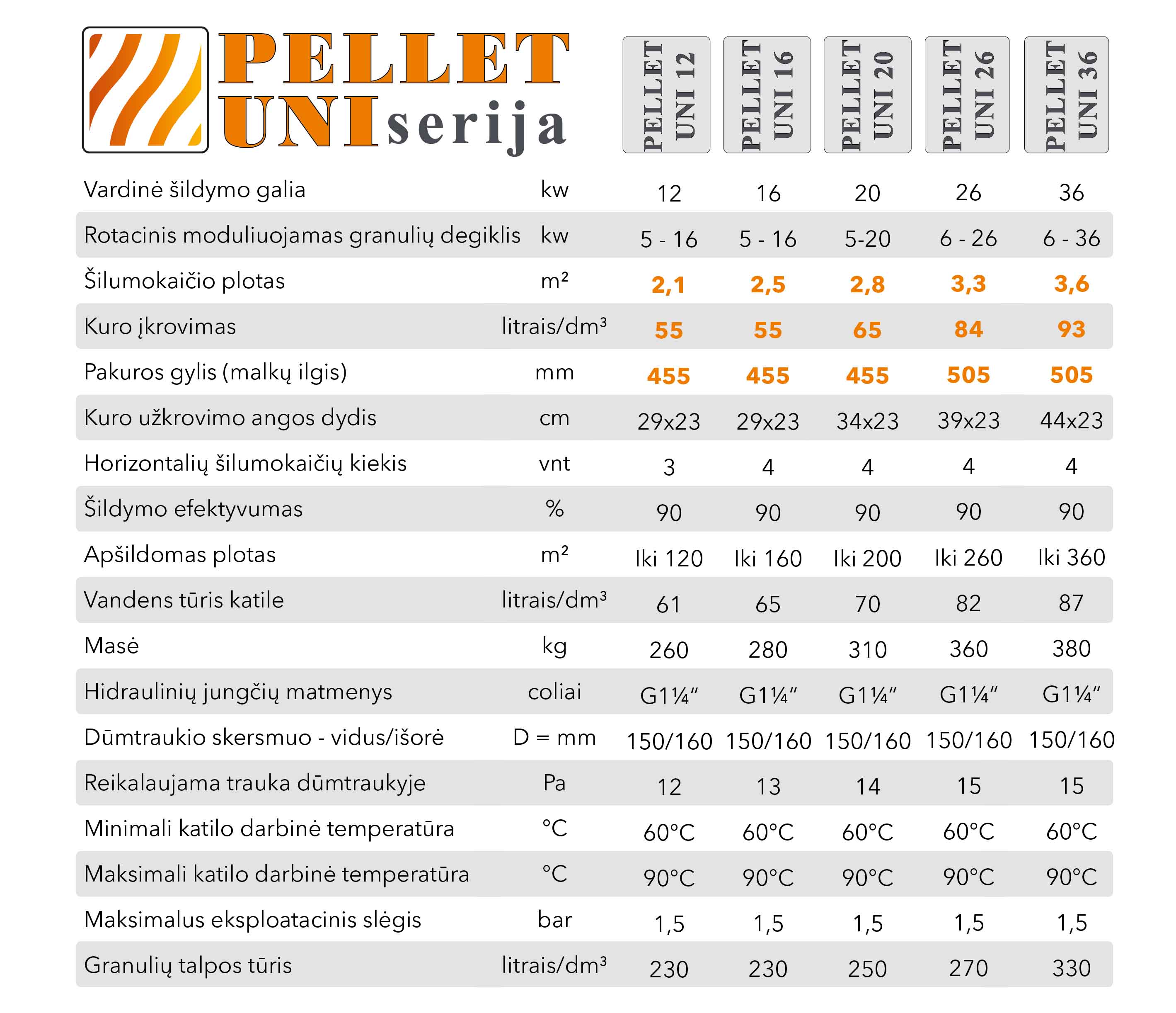 „PELLET UNI“ katilas – tai 5 klasės, aukščiausios kategorijos ir techninio lygio modelis, atnaujintas 2020 metais. Ekonomiškumas ir ekologija patvirtinta sertifikatu, išduotu Lietuvos energetikos instituto. „PELLET UNI“ 12-26 kW katilai atitinka visus reikalavimus gauti valstybės paramą nuo 1200 iki 1800 eurų už katilą.