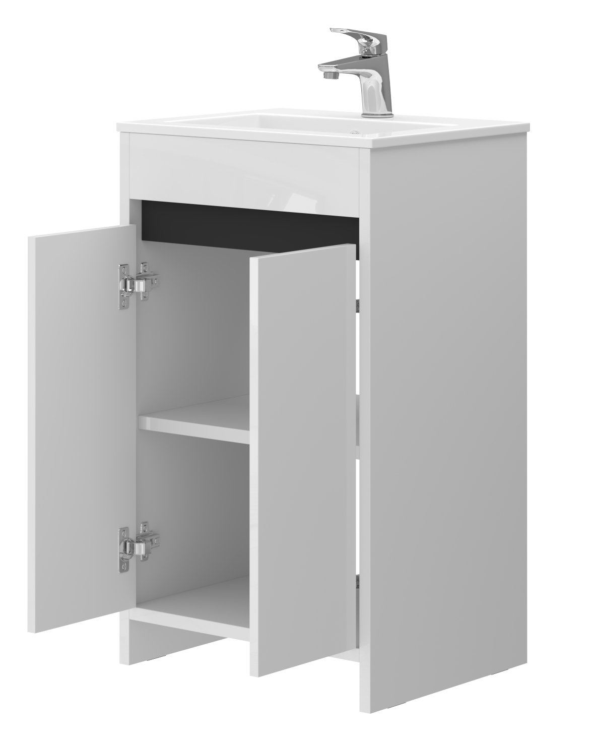 Gaminys turi dvi duris. Vidinę erdvę už durų skaido viena lentyna iš 16 mm storio baltos spalvos laminuotos medžio drožlių plokštės.