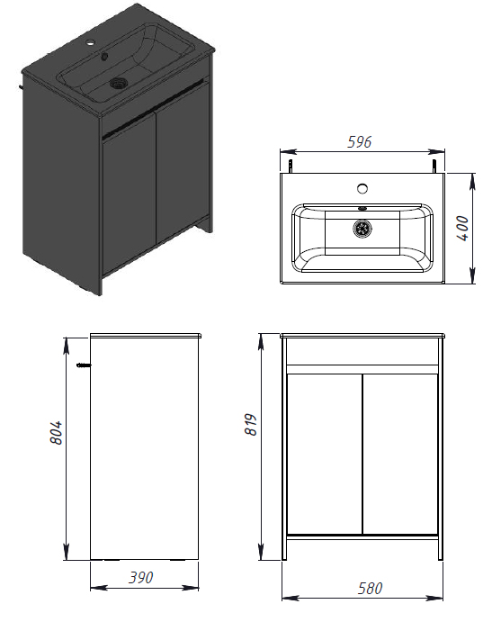 Korpusas ir priekinės spintelės dalys pagamintos iš 16 mm storio laminuotos medžio drožlių plokštės.