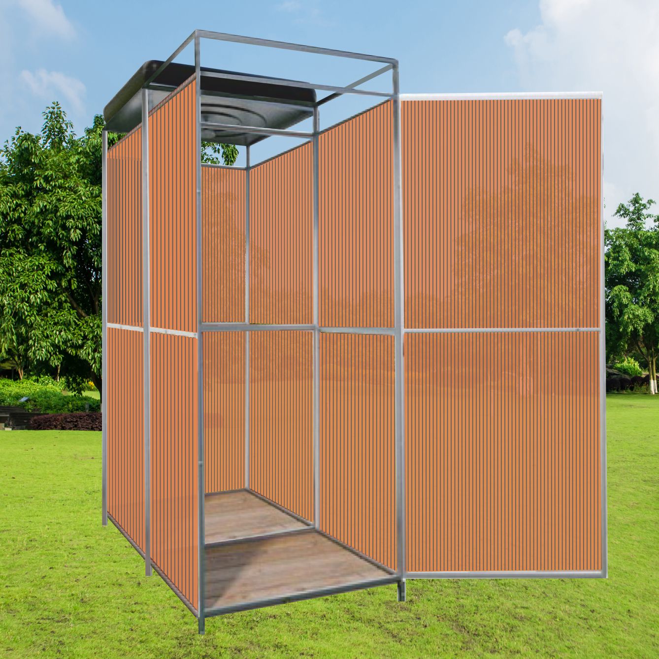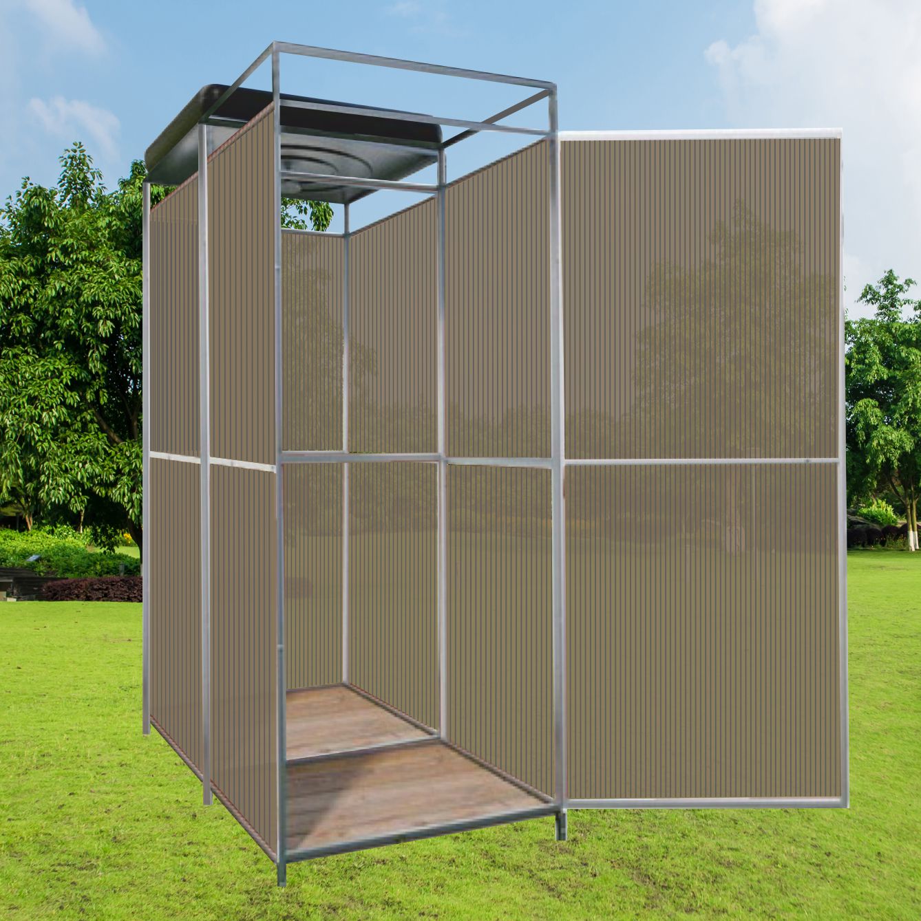 Dušo kabinos konstrukcija, pagaminta iš cinkuoto vamzdžio 20x20 mm ir 20x15 mm, rėmas dengiamas polikarbonato danga.