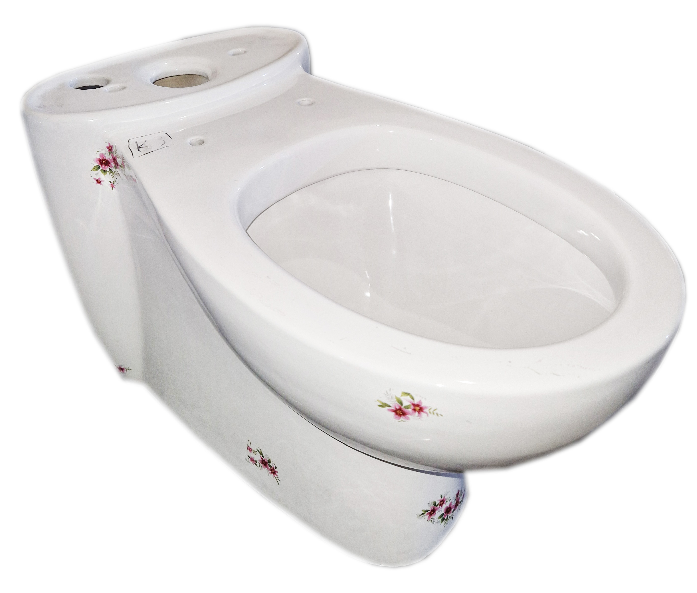 Pastatomo klozeto apačia (be bakelio) dekoruota rožinės spalvos gėlėmis.
