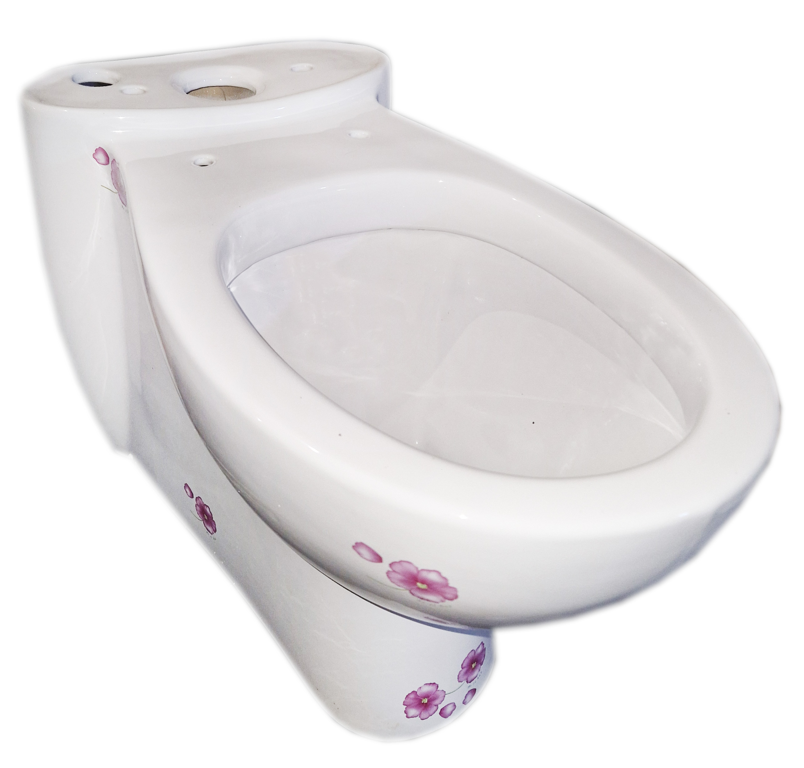 Pastatomo klozeto apačia (be bakelio) dekoruota rožinės spalvos gėlėmis.