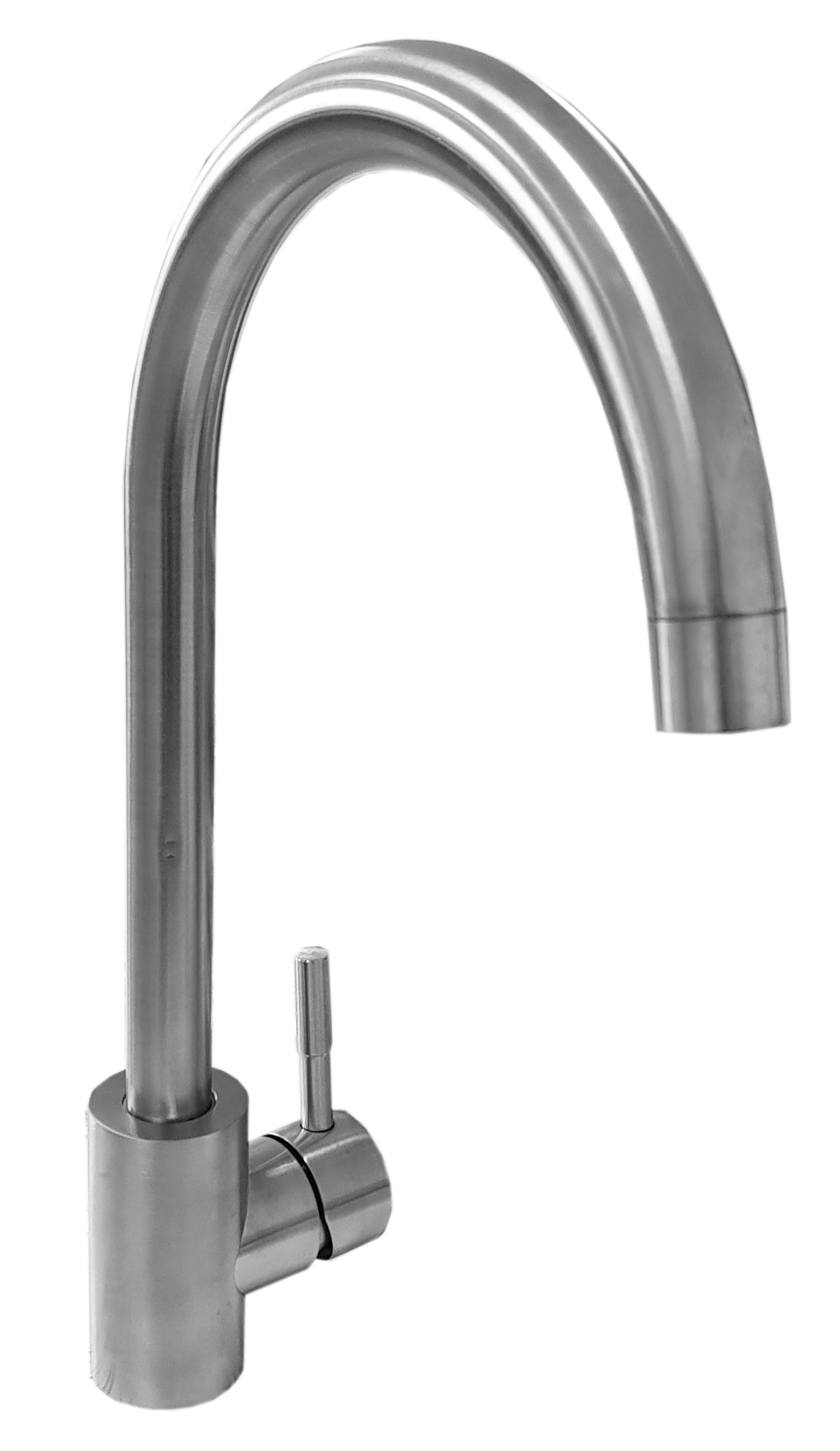 Vienos svirties nerūdijančio plieno virtuvinis maišytuvas aukštu lenktu snapu.