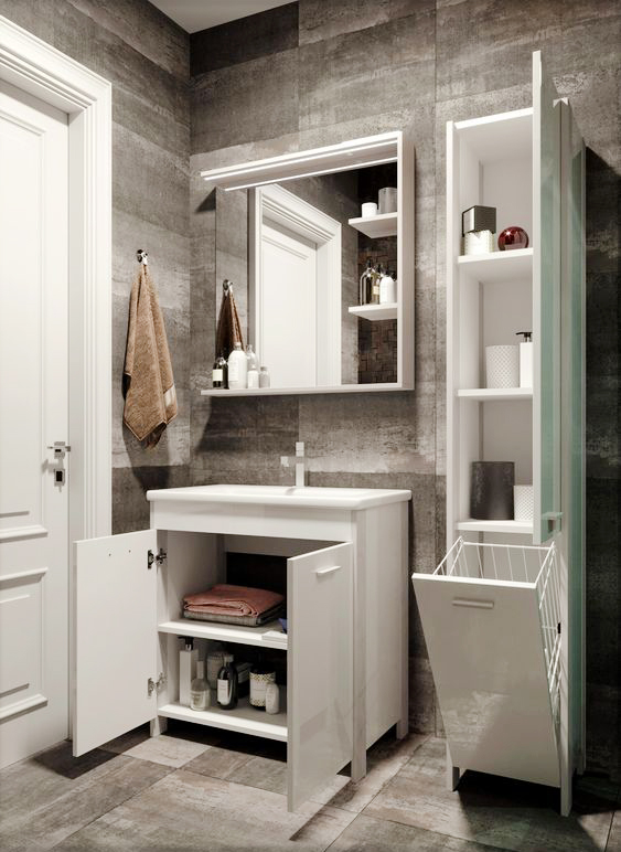 Aukštas spintelės dizainas turi du skyrius už durų. Viršutinio skyriaus vidinę erdvę dalija dvi lentynos, pagamintos iš baltos 16 mm storio medžio drožlių plokštės. Už apatinių durų yra skalbinių krepšelis.