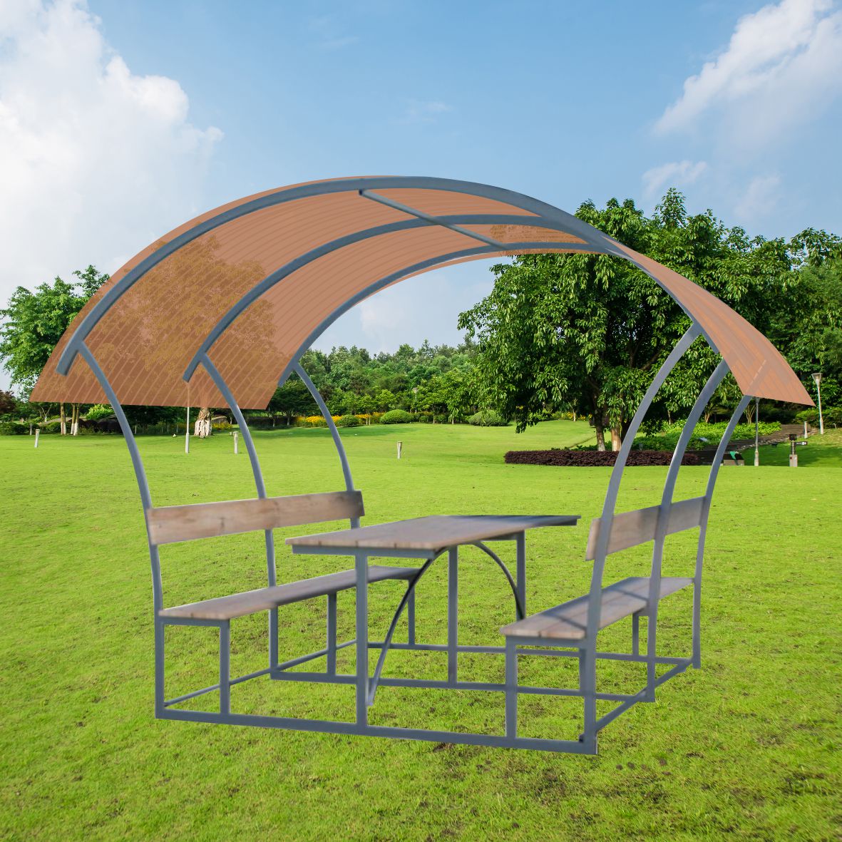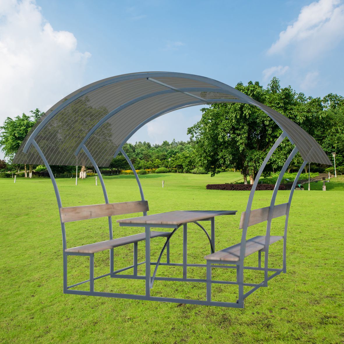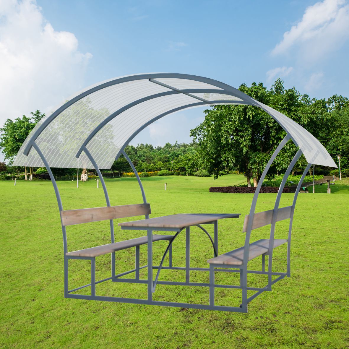 Pavėsinė padengiama polikarbonatine danga.