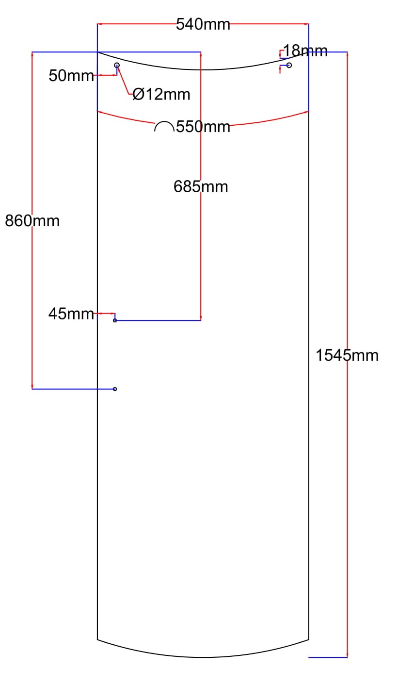 Matmenys: 540x1545 mm (lenkta dalis 550 mm)