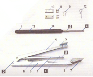 A - cilindro anga, B - movos anga, C - anga, D - maksimalaus atidarymo anga, E - sriegiai