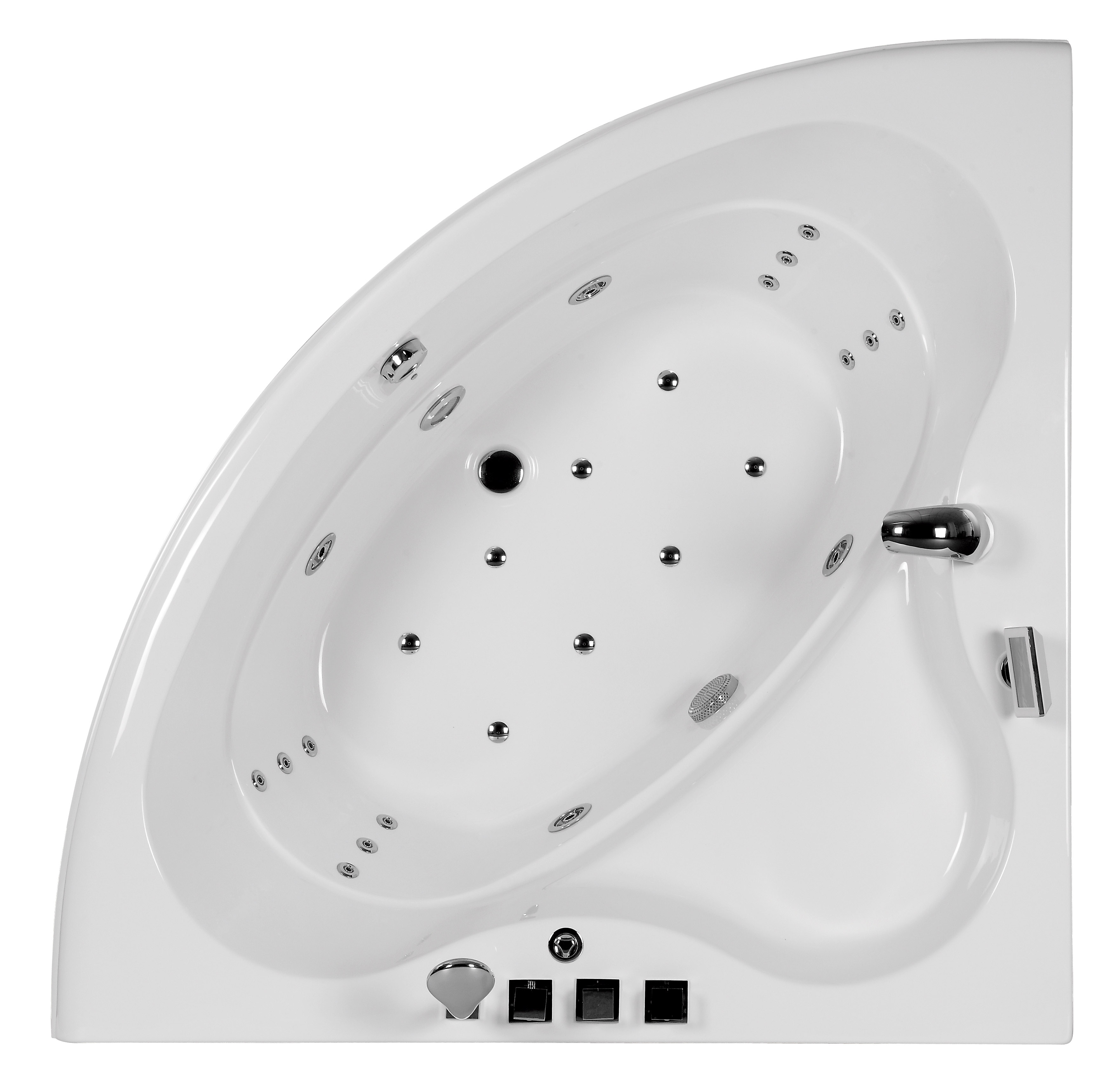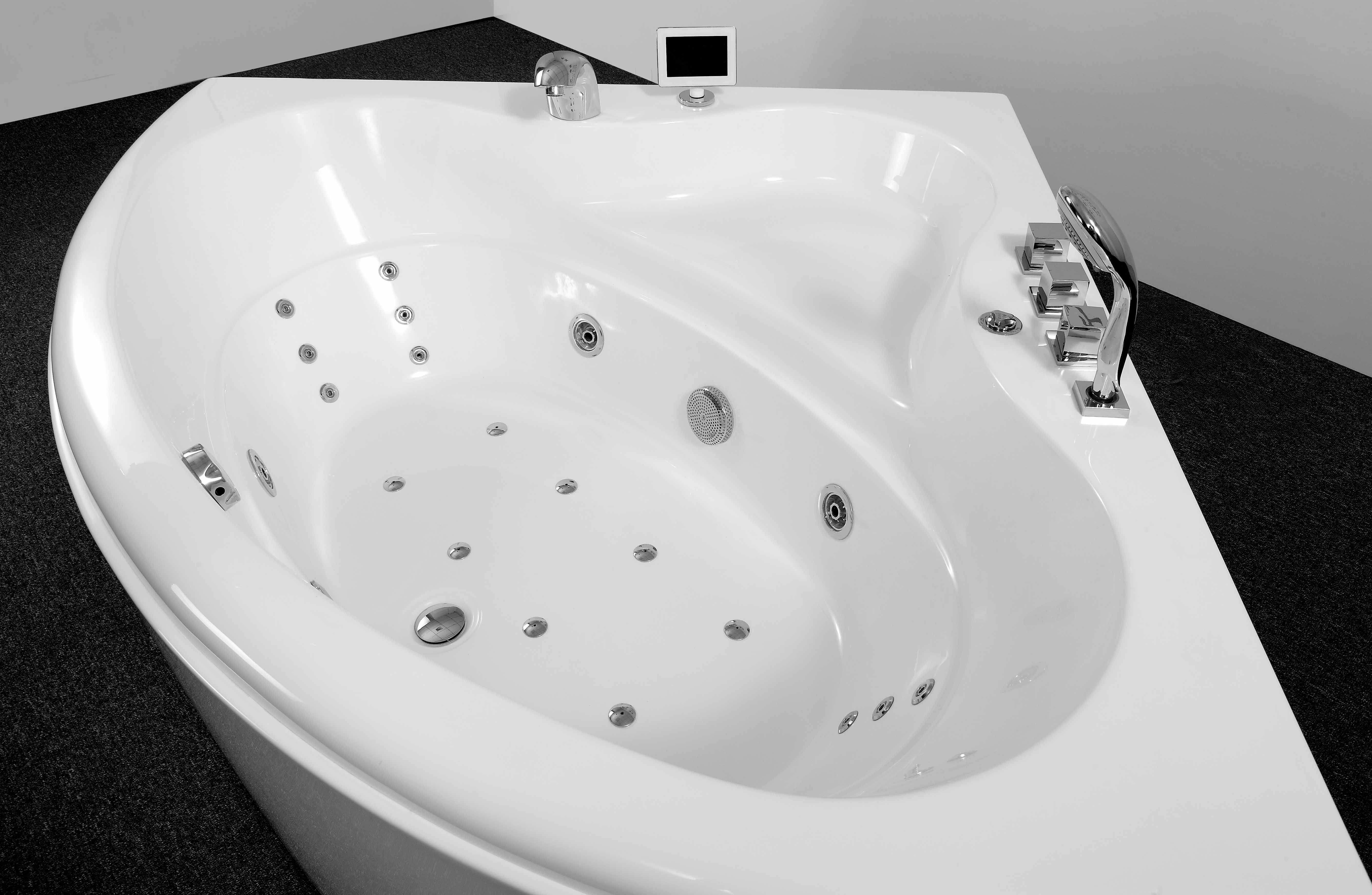 Masažinė kampinė dvivietė vonia su vandens ir oro masažu, ir vandens šildytuvu.