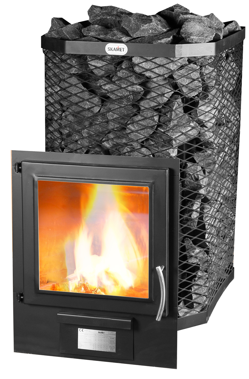 Malkinė pirties krosnelė su išorine pakura ir kvadrato formos tinkliniu korpusu akmenims.