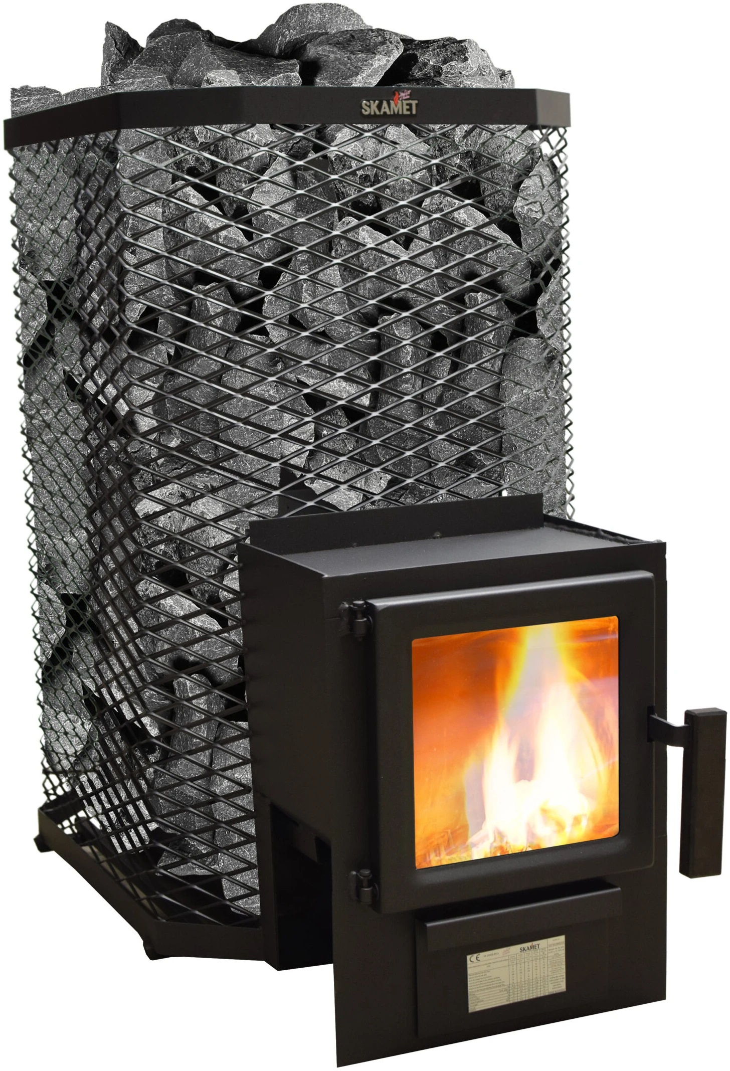 Malkinė pirties krosnelė su išorine pakura ir kvadrato formos tinkliniu korpusu akmenims.