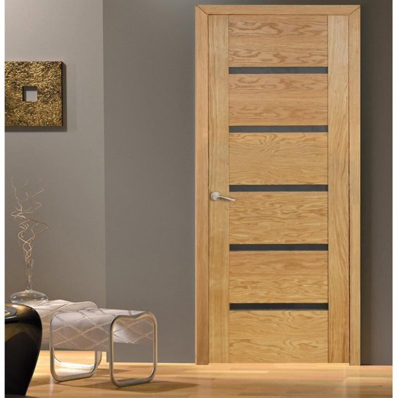 Durų varčios apdaila – natūrali faneruotė, gamybos procese tonuojama beicu ir lakuojama ekologišku, bekvapiu, „vandens pagrindu“ laku, karkasas ir stakta pagaminti iš klijuotos pušies masyvo.